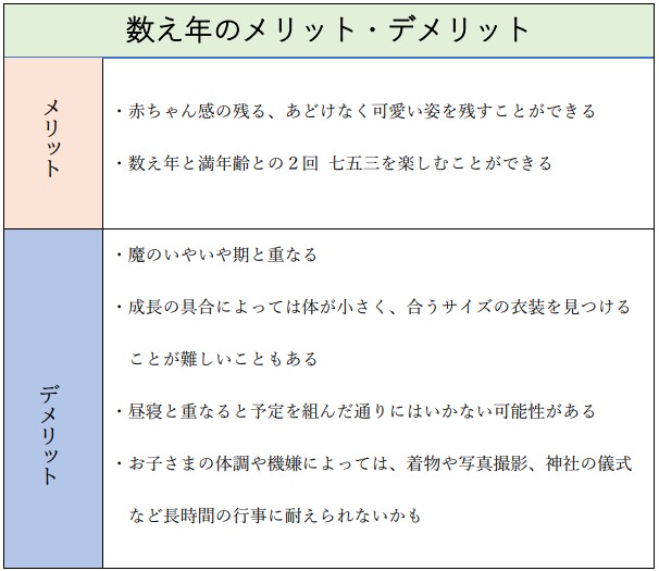 早生まれとは1月1日~4月1日の間に生まれた人のことで、学校教育では同年生まれの子よりもひとつ上の学年に組み込まれます。 そのため早生まれという呼び方になったと言われています。 早生まれのお子さまが満年齢で七五三を行う場合は次年度の11月になるため、早生まれではない同級生と一緒にお祝いできなくなります。 「数え年」「満年齢」「早生まれ」と考えるポイントがいくつかあり、ややこしく思えてしまいますが、現代の七五三では行うべき時期が明確に定められているわけではありません。 七五三のお祝いをする頃の年齢は、お子さまの成長に個人差が大きくなります。 特に3歳の場合は、数え年なら まだ1,2歳となるため長時間の和装や神社での儀式に耐えられなかったり、トイレトレーニングの最中で心配事が多かったり、お昼寝の時間との調節が大変だったりするでしょう。 最近では、男女ともに満年齢で七五三をお祝いすることが主流となってきていますが、早生まれのお子さまの場合は同級生と同じタイミングでお祝いをしたいというご両親も多く、数え年を選ばれるご家庭もあります。