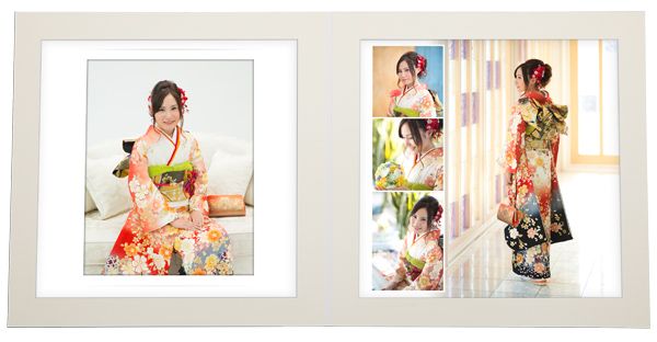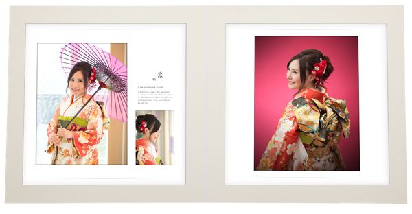表紙にお着物の柄が入る一番人気のアルバムです。表紙に透明度の高いアクリル加工を施した、高級感溢れるデザインアルバムで、思い出のご記念の一日をいつまでも色鮮やかに再現します。 お写真はラミネート加工をした光沢仕上げですので、耐久性に優れており、退色しづらいのが特徴です。