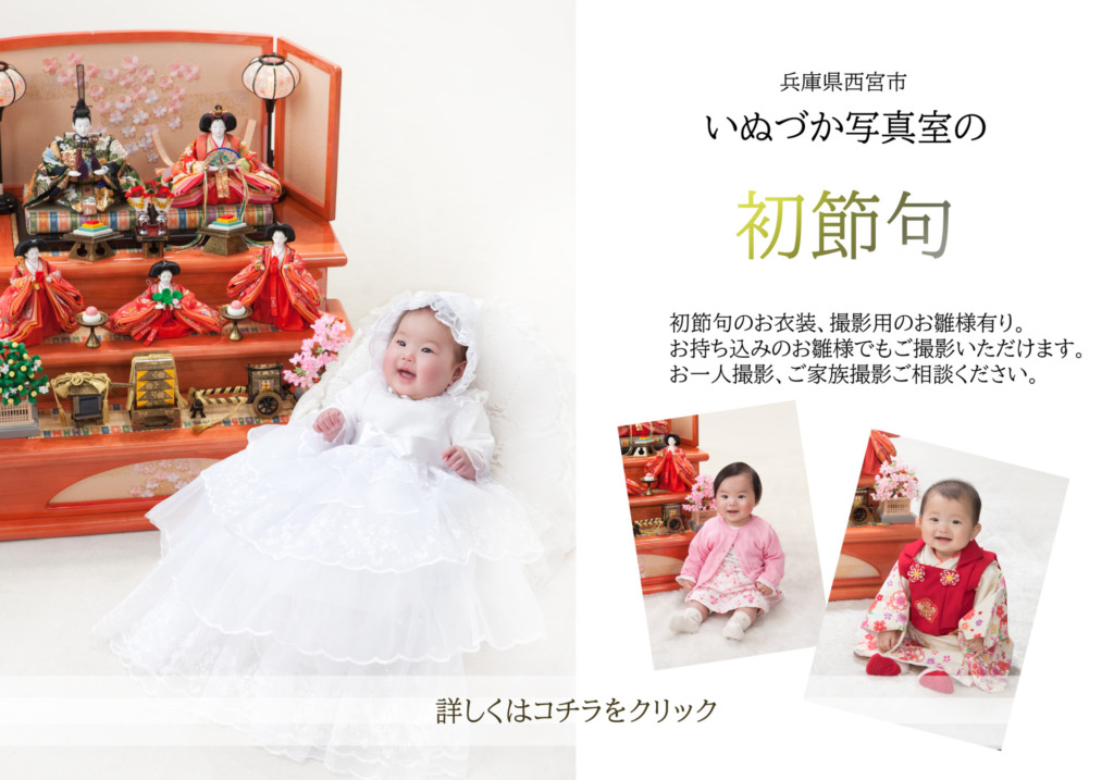 お雛様を背景にした上品なセットで、ご家族さまの思い出に残るお写真を丁寧にお撮りします。
